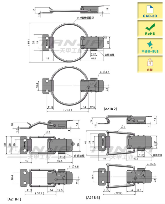 搭扣獨特的自鎖機構(gòu)設(shè)計,防止搭扣在使用過程中彈開,使用方便安全
