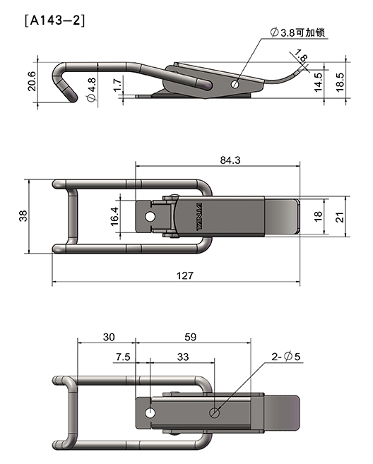 A143-2:弧形彈簧鋼線使搭扣具有彈性預壓力,并具有減振功能