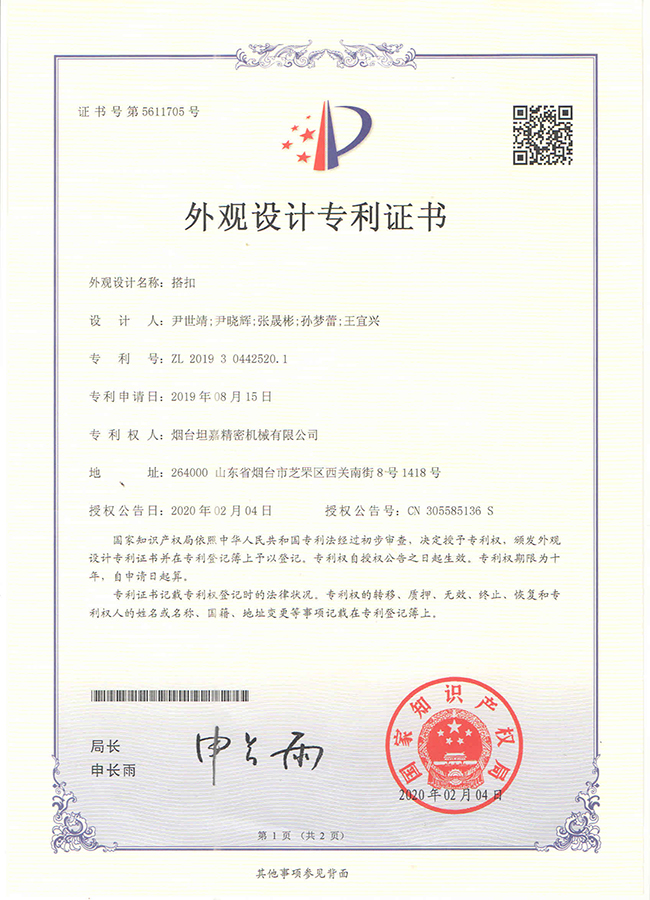 坦嘉精密于2020年2月4日,搭扣A104外觀設計專利順利通過國家知識產權局審查并獲得授權,在公司團隊不斷努力下,我司在產品自主設計和創新方面又一次取得專業性的突破。