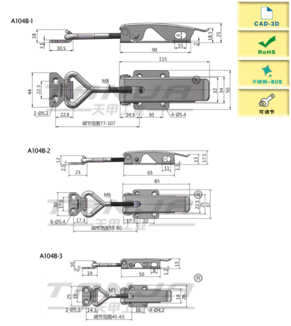 可調節搭扣雖然外形比較特殊,但是也是搭扣的一種,常用于車輛/包裝/機械設備/振動設備等方面,能夠承受的拉力較之其他搭扣很大。