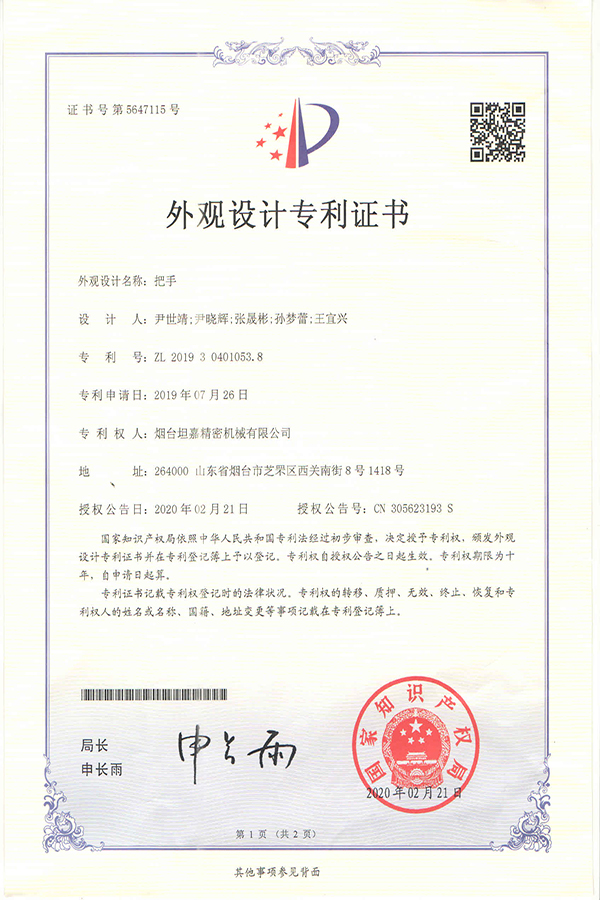 坦嘉精密于2020年2月21日,把手L38外觀設計專利順利通過國家知識產權局審查并獲得授權,在公司團隊不斷努力下,我司在產品自主設計和創新方面又一次取得專業性的突破。