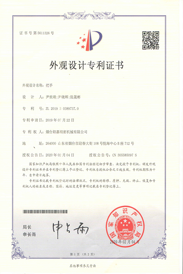 坦嘉精密于2020年2月4日,把手L43外觀設計專利順利通過國家知識產權局審查并獲得授權,在公司團隊不斷努力下,我司在產品自主設計和創新方面又一次取得專業性的突破。