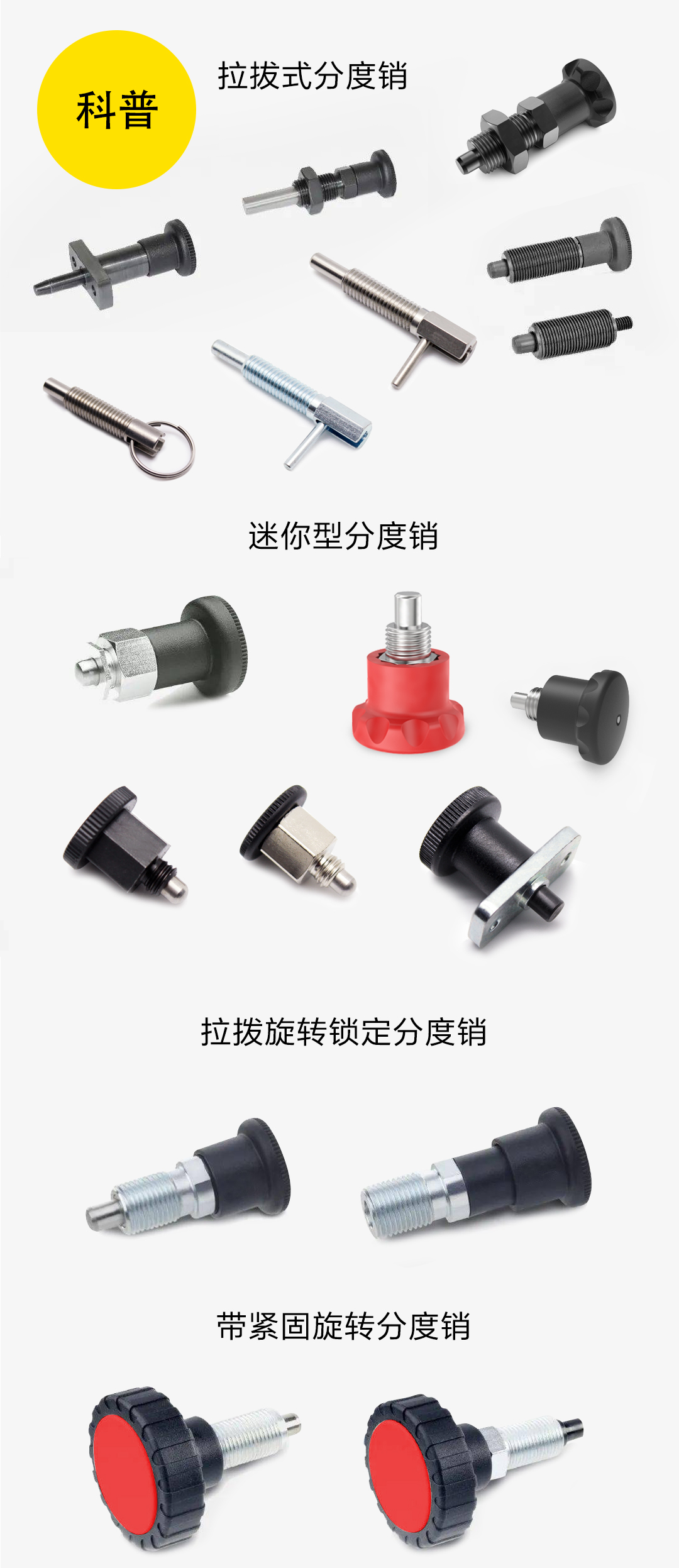 分度銷通常有以下幾類:復位型分度銷,自鎖型分度銷, 全螺紋分度銷, 短螺紋分度銷, 帶法蘭分度銷, 帶拉環分度銷, 把手型分度銷, T型分度銷。