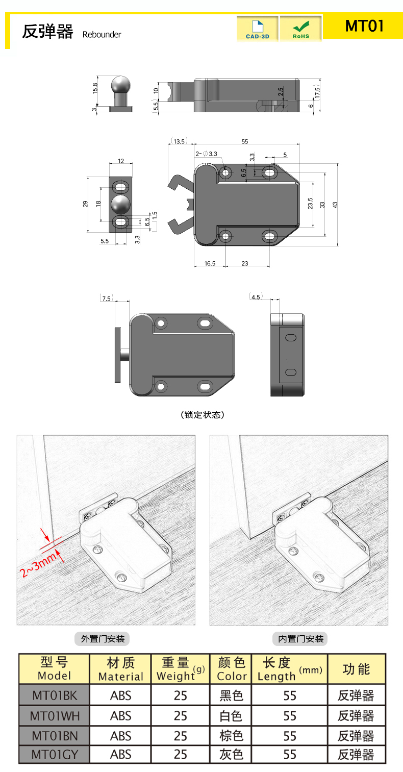 非磁性卡扣設計,施壓即開,關門即鎖門,自帶反彈力,無需裝拉手