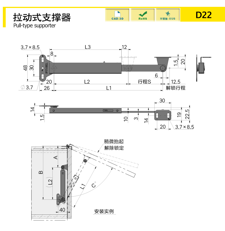 可根據門高及門開啟角度,決定適當的支座位置。此時,應確保安裝實例中的(L2)尺寸大于下圖的L2尺寸