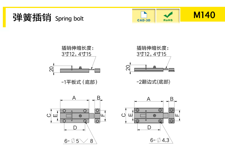 | 型號 | 材質 | 重量(g) | 長度(mm) ![]() | 顏色 | 表面處理 ![]() | A | B | C | D | E | F | 功能 | 3D圖紙 | 選購 | |||