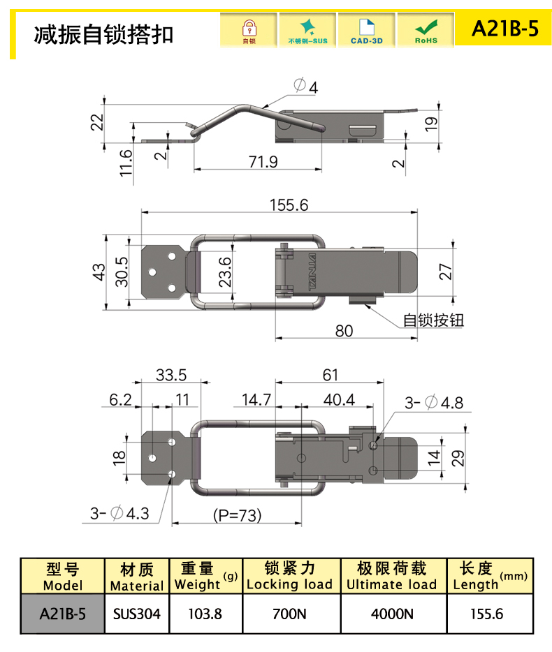 搭扣獨特的自鎖機構設計,防止搭扣在使用過程中彈開,使用方便安全