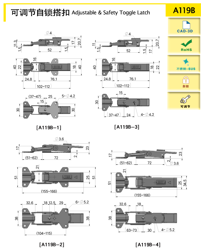 | A119B-3 | 102-112 | SUS304 | 77.6 | 500 | 1500 | 可調(diào)節(jié),自鎖 | 下載 | ||||