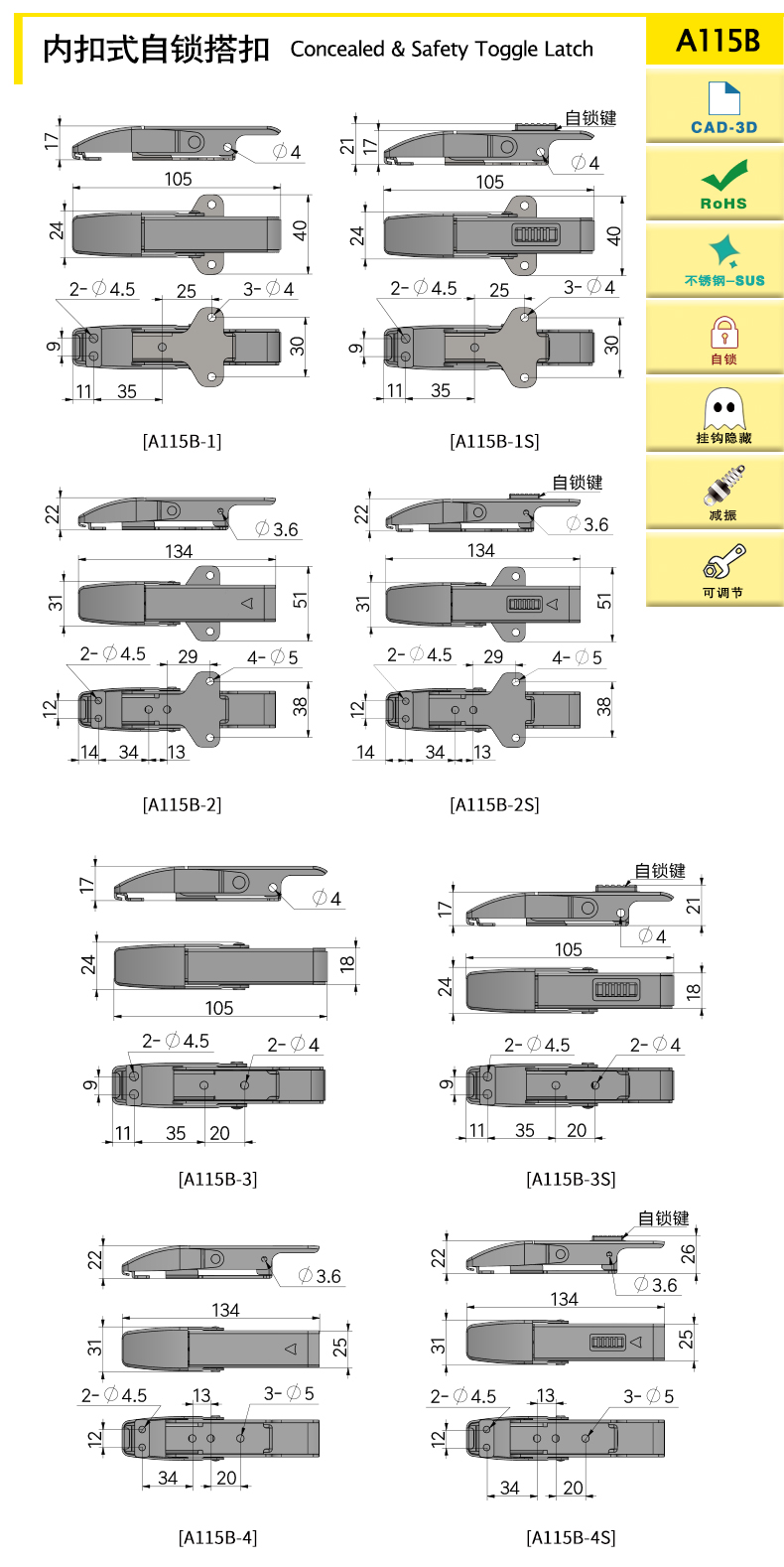 | A115B-3S | 106 | SUS304 | 76.71 | 200 | 2000 | 內扣式,自鎖 | 下載 | ||||