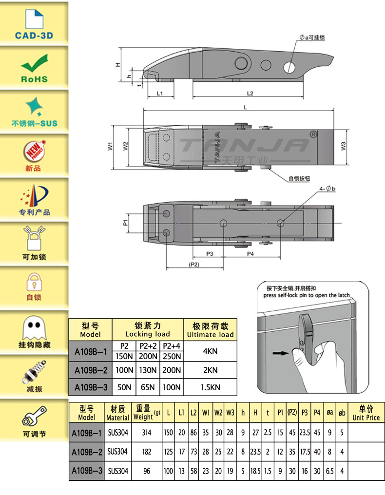 獨特的安全銷可以實現自鎖功能,具有可靠的安全性,搭扣不會因振動松脫