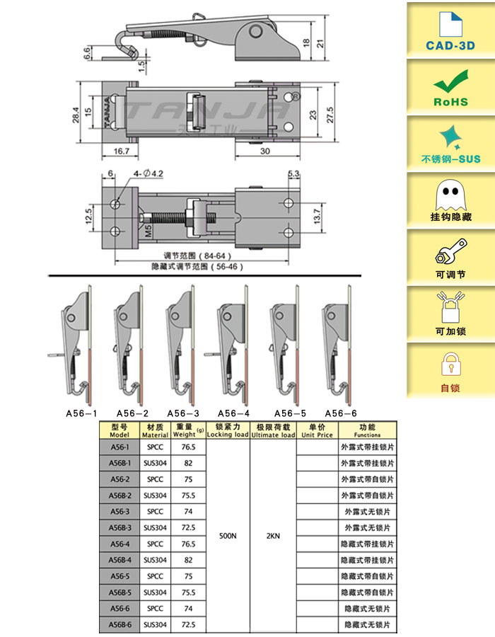 | A56-4 | 81.4 | SPCC | 76.93 | 500 | 2000 | 內(nèi)扣式,可調(diào)節(jié),帶鎖 | 下載 | ||||