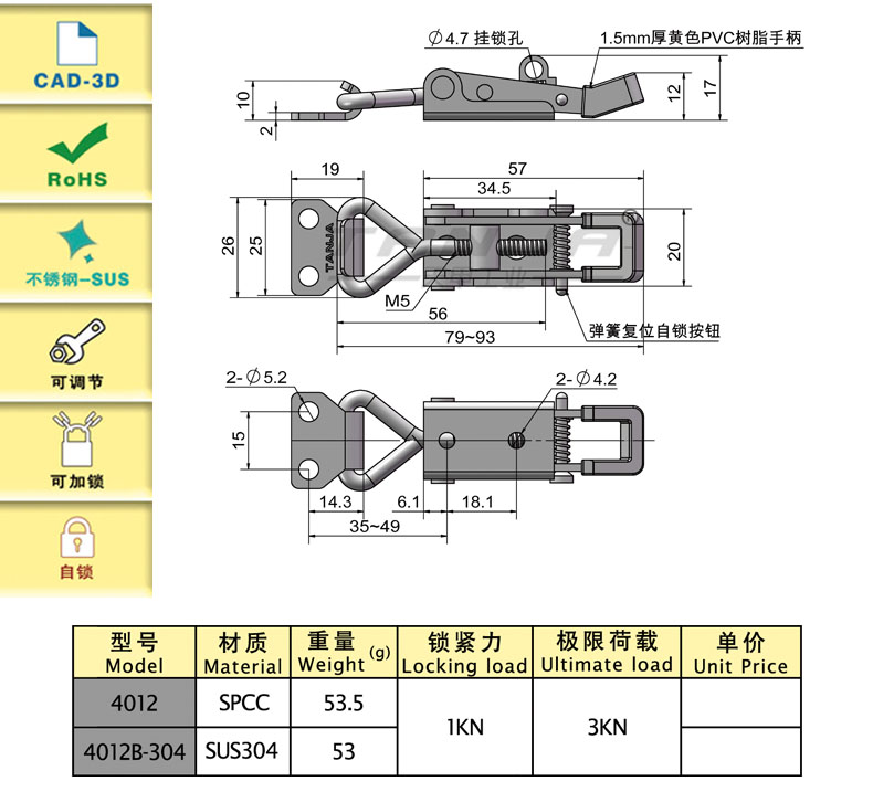 搭扣獨(dú)特的自鎖機(jī)構(gòu)設(shè)計(jì),防止搭扣在使用過(guò)程中彈開(kāi),使用方便安全