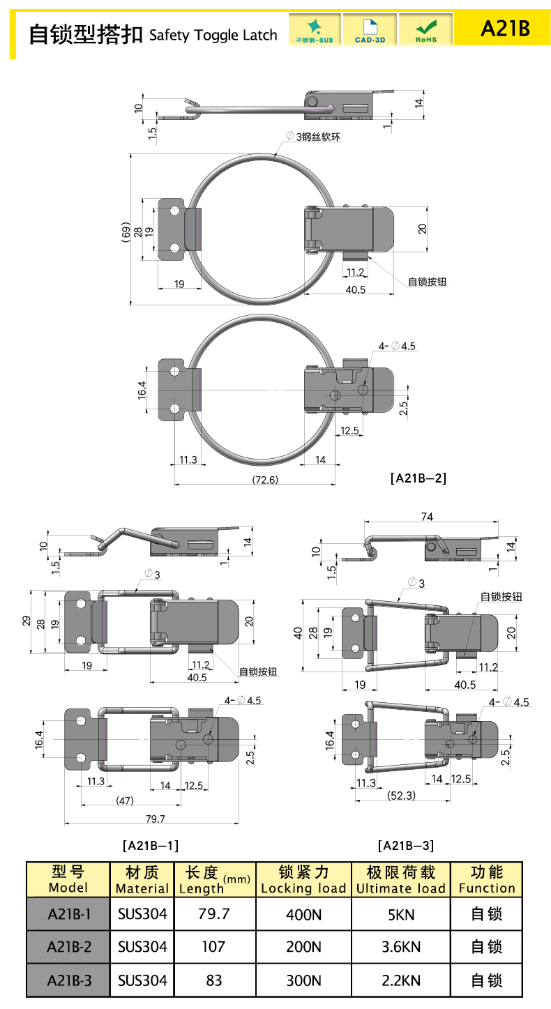 搭扣獨特的自鎖機構設計,防止搭扣在使用過程中彈開,使用方便安全