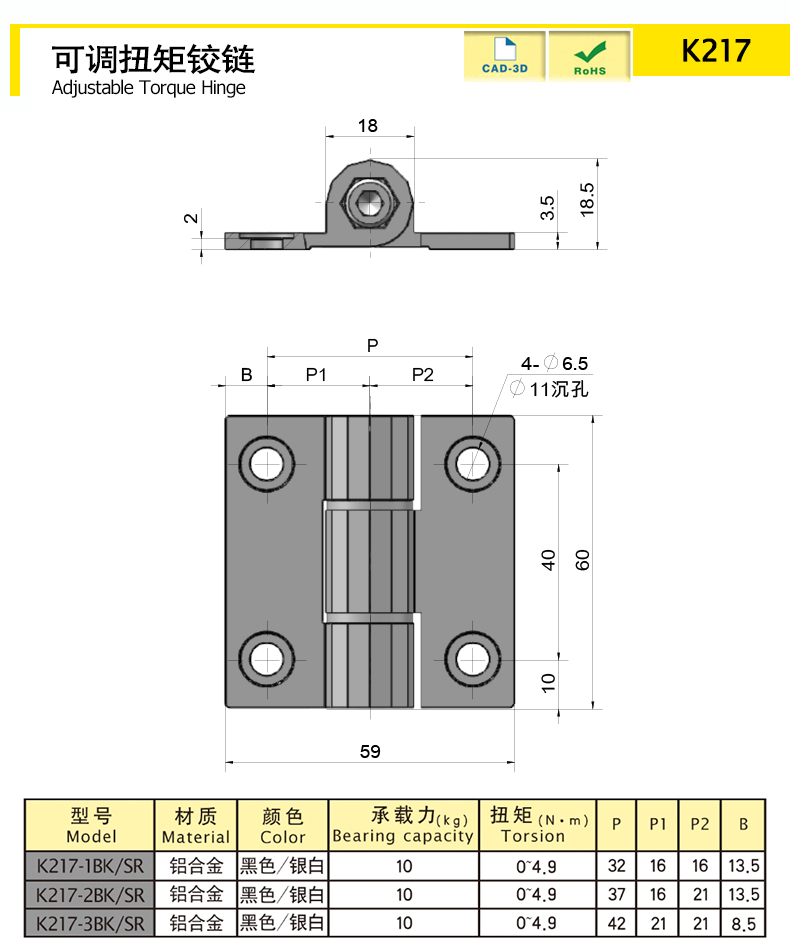 | K217-3BK | 鋁合金 | 60 | 黑色 | 71.01 | 可調(diào)扭矩 | 下載 | ||||