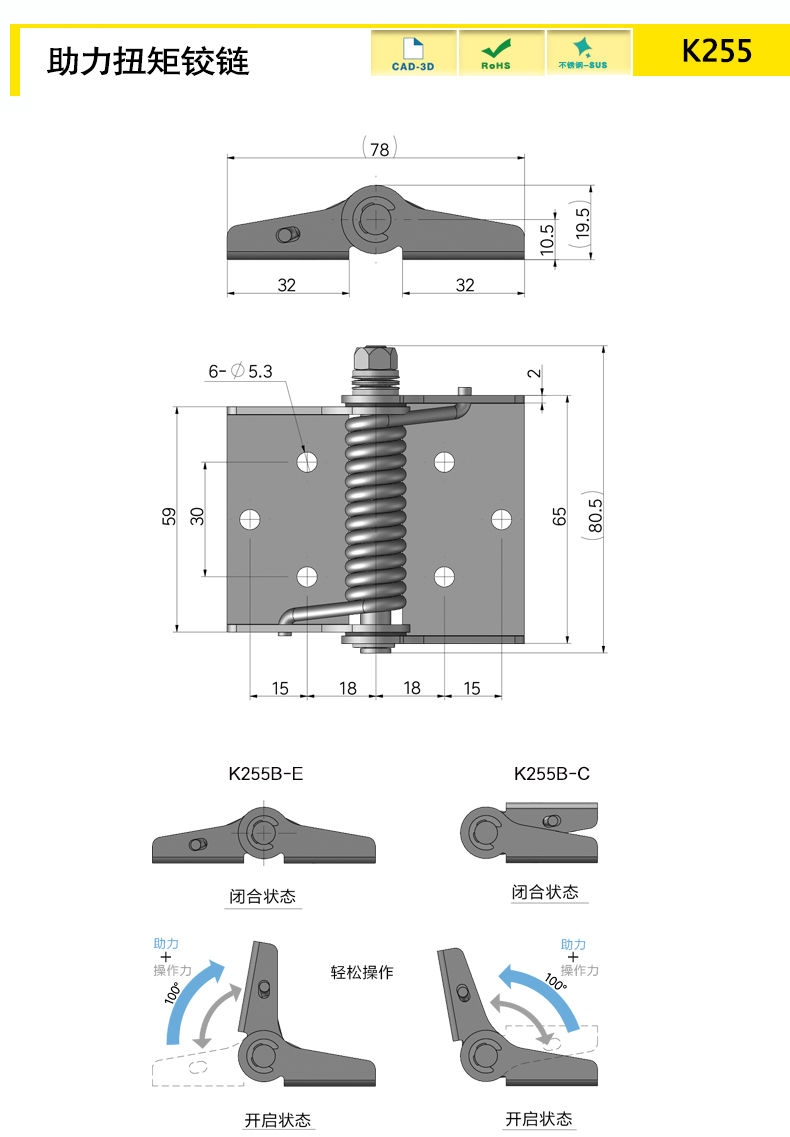 K255B-E外裝助力扭矩鉸鏈;K255B-C:內裝助力扭矩鉸鏈