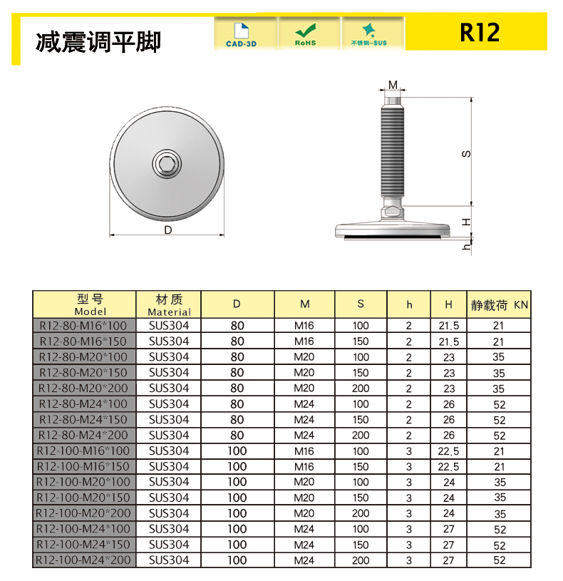 | 型號 | 材質 | 直徑D | M | S | H | h | 重量(g) | 靜載荷(KN) | 3D圖紙 | 選購 | |||